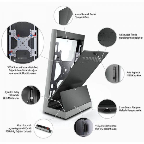 Vous pouvez facilement intégrer tous les moniteurs et téléviseurs au VESA standard. Vous trouverez un espace dédié pour fixer aussi votre PC ou votre player sur un support VESA standard si votre moniteur n’est pas équipé d’un player interne.